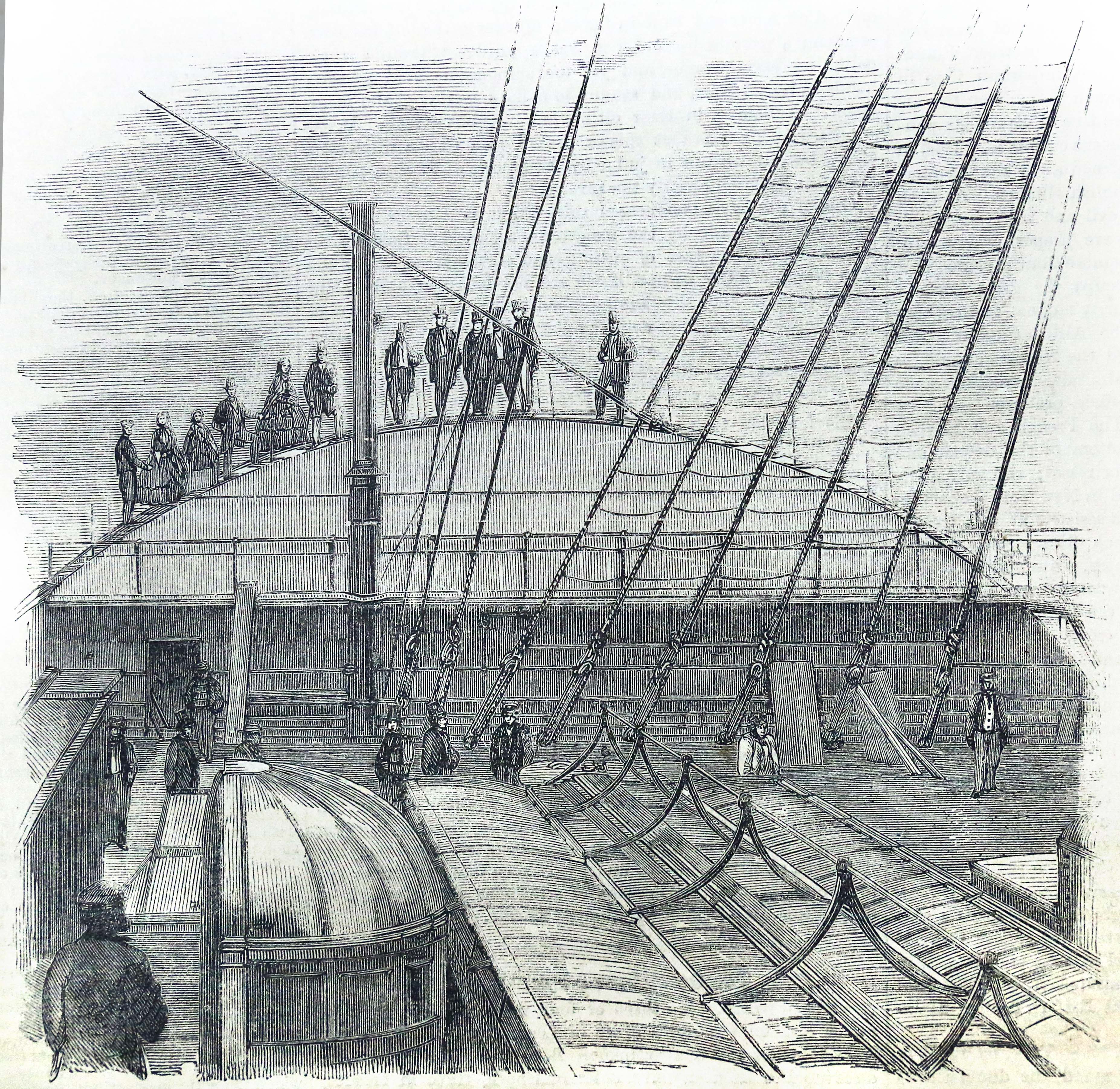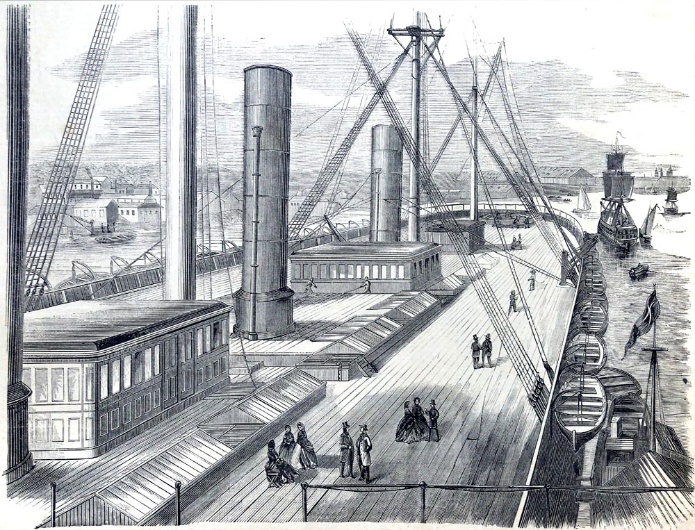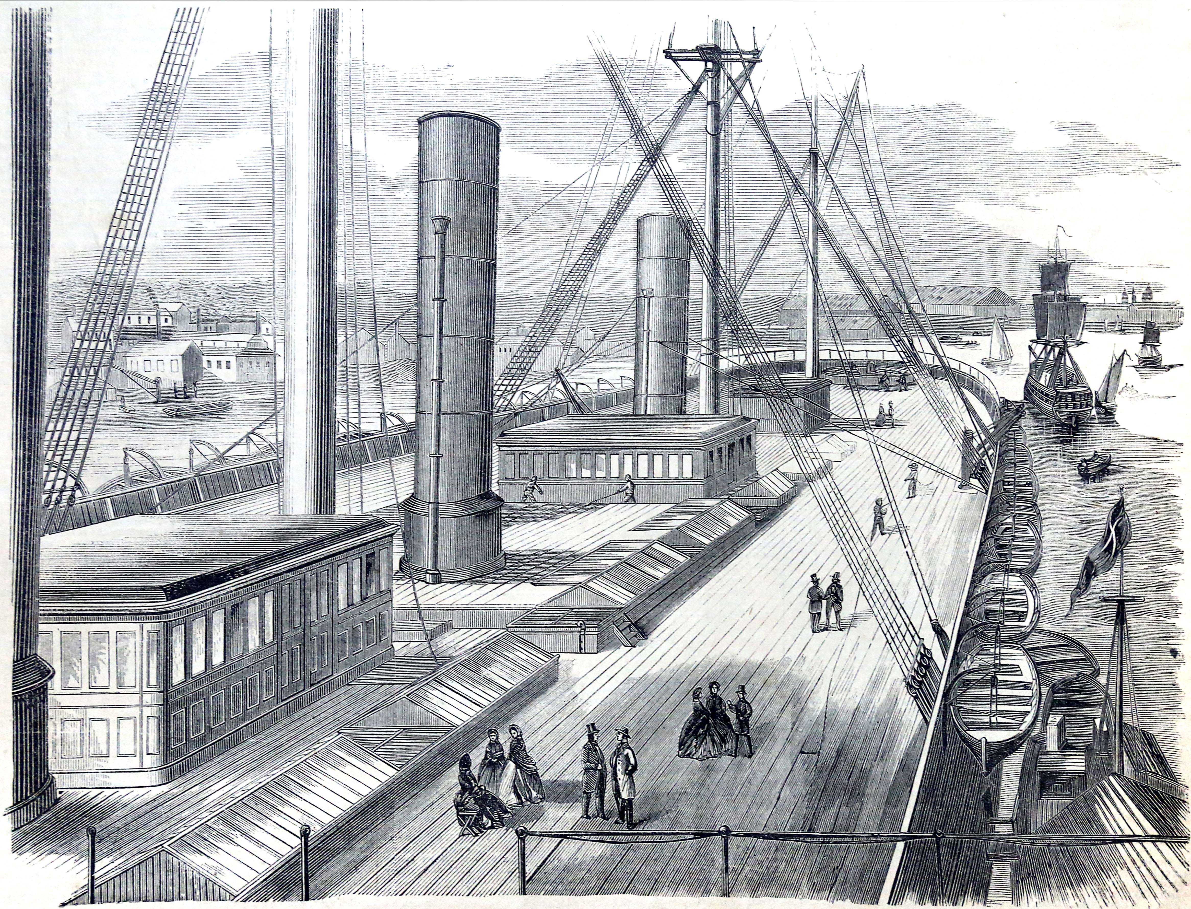 “View of the deck of the Great Eastern from one of the paddle-boxes, looking astern”