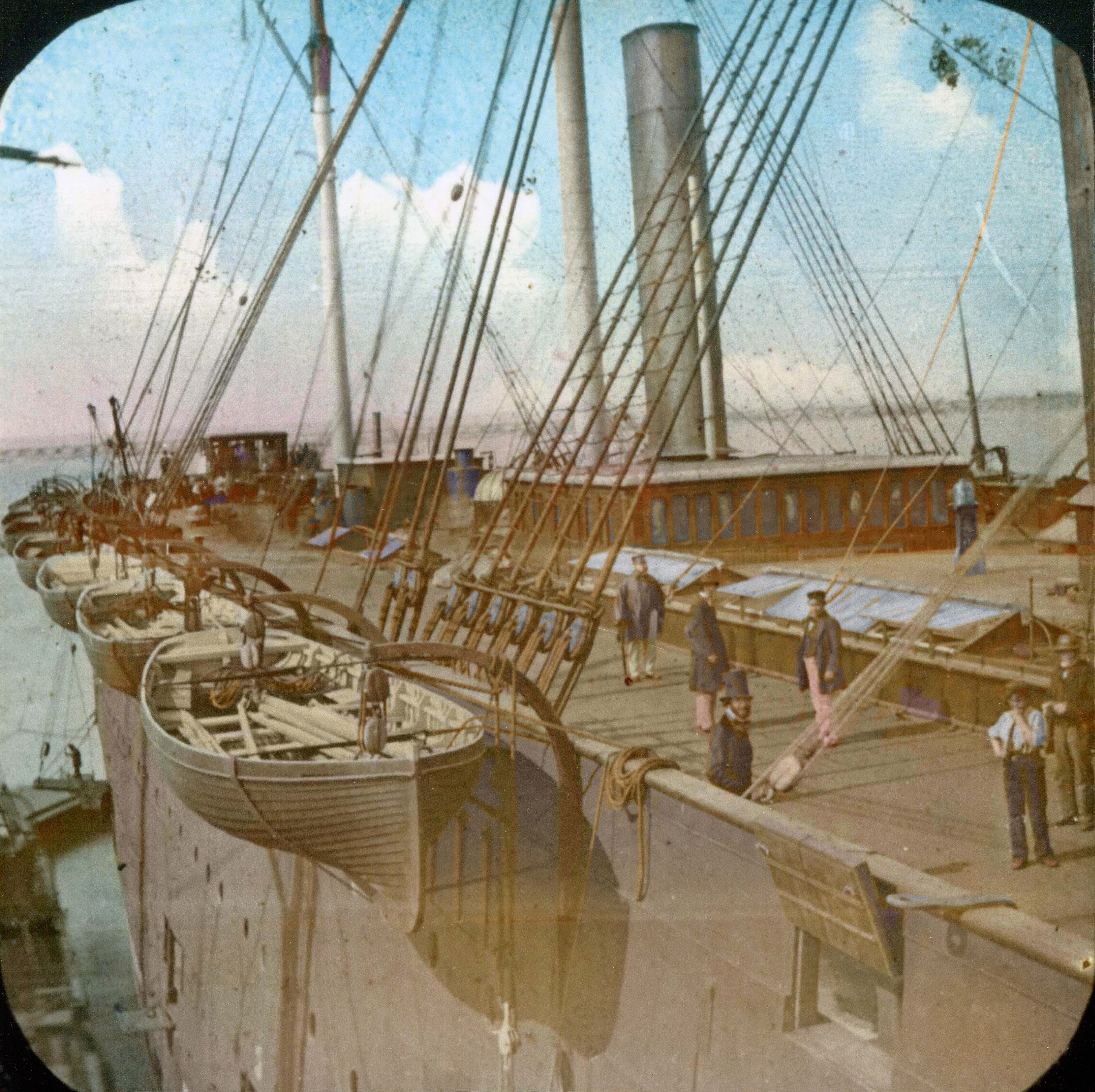 Undated magic lantern photograph of deck of Great Eastern taken from her starboard paddle box